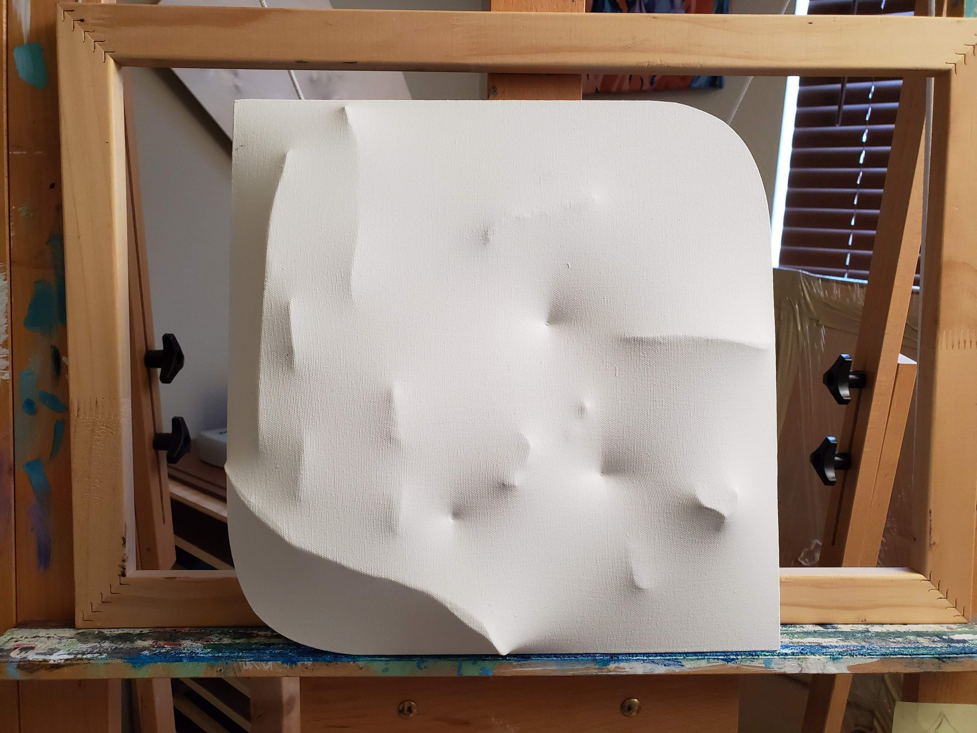 Oil on canvas with masonite, wood and thread